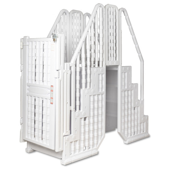 The Trinidad Bridge System with gate features two full sets of steps, making it safe and easy to get in and out of your above-ground pool. Constructed from non-corroding vinyl, this 4-step entry system offers a gradual incline, making it more accessible than standard pool ladders. The solid dual handrails and non-skid steps ensure trouble-free use. Designed to fit 48-inch to 54-inch steel-walled pools, the system includes a platform bridge that protects the top rail of your pool. For added security, the self-closing, self-latching gate is lockable, preventing entry when the pool is not in use. This system meets all local codes for ladder enclosures and pool entry systems and supports up to 350-lbs.